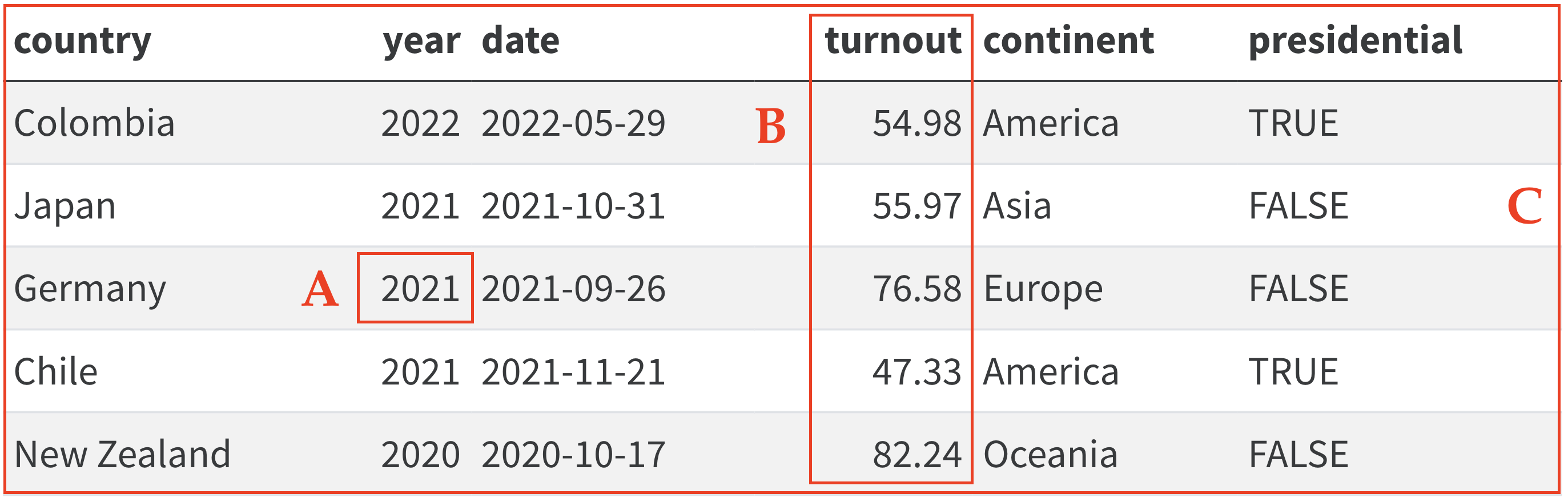 Fixem-nos en el marc de dades que veiem a la figura 1, que representa les dades de participació en les últimes eleccions de diversos països. El marc de dades (C) està format per varis vectors (B). Cada vector està representat en una columna diferent del marc de dades. Tots els vectors d’un marc de dades tenen la mateixa longitud. En aquest exemple, tots els vectors són de longitud cinc. Això significa que cada vector està format per cinc valors (A). Cada valor és una casella del marc de dades i és la unitat més petita d’R que estudiarem.
