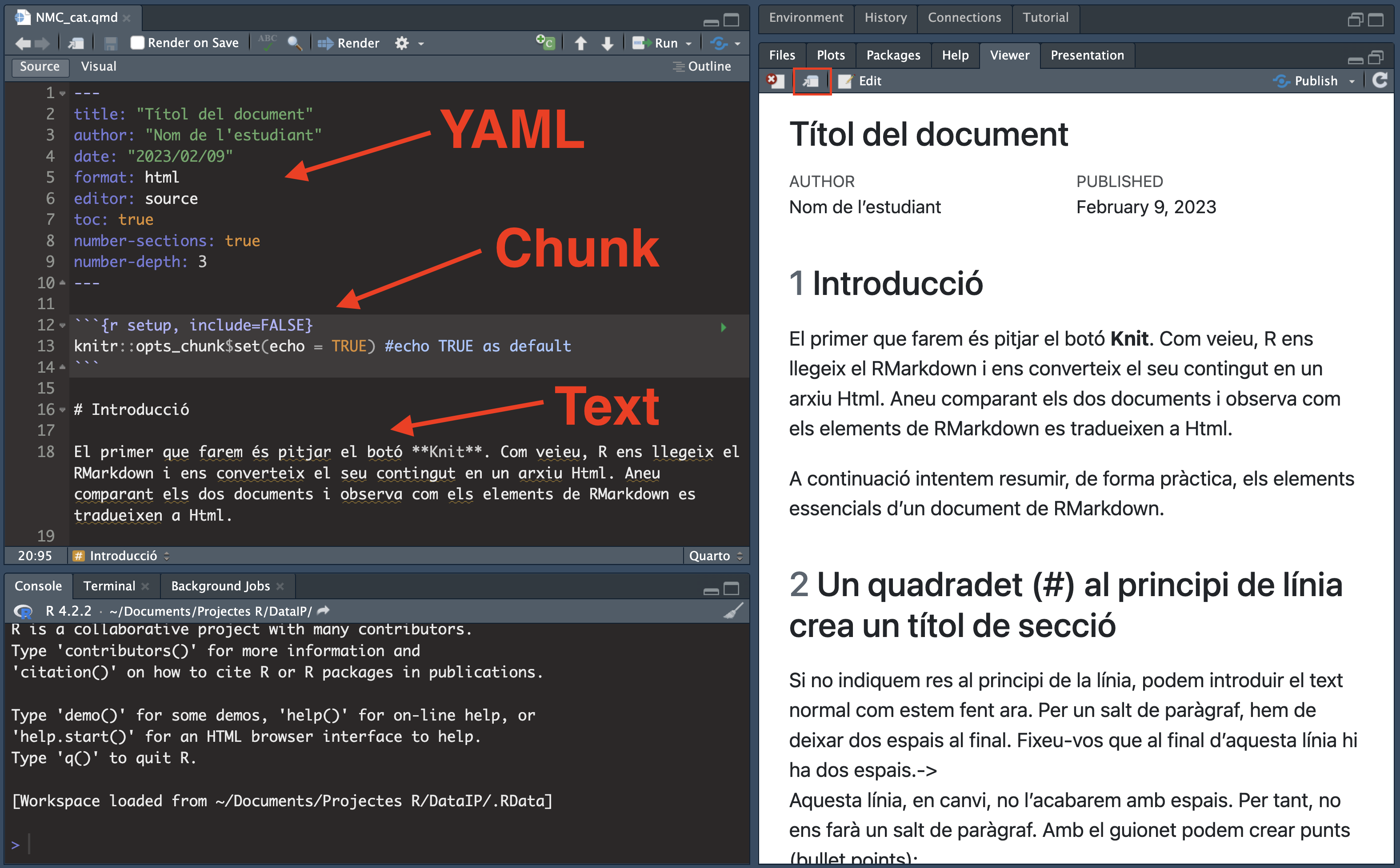Si observem amb atenció el document de Quarto i el comparem amb l’Html que acabem de generar, veurem que el YAML conté elements com el títol o la data. També observem que el símbol # sembla marcar els apartats del document. I també veiem que, curiosament, el chunk no apareix a l’Html. A continuació explicarem amb detall aquests tres elements: YAML, text i chunk.