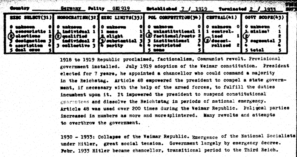 L’impulsor del projecte Polity, Ted Gurr, volia estudiar les característiques dels règims polítics i observar quines eren les seves condicions institucionals que afavorien l’estabilitat i la durabilitat dels estats. La seva base de dades acabaria sent durant dècades la més utilitzada per molts acadèmics per estudiar la democràcia. Ted Gurr classificava els règims polítics sobre la base de diverses característiques, com si existien límits al poder executiu, hi havia competició política entre partits o bé si l’estat era centralitzat o descentralitzat. En la següent Figura 1.2 es pot observar com era la fitxa que utilitzava Gurr per classificar el règim d’Alemanya des de 1919 fins a 1933, corresponent al període de la República de Weimar.