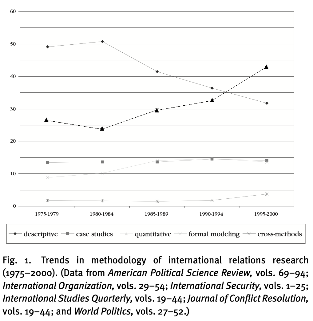 Aquestes contribucions han enriquit la diversitat metodològica de les RRII, un dels pilars fonamentals en qualsevol disciplina científica. La Figura 1.4 examina les tendències metodològiques en les principals revistes acadèmiques de RRII entre 1975 i 2000 (Sprinz & Wolinsky-Nahmias, 2004). Les revistes consultades són American Political Science Review, International Security, International Organization, International Studies Quartely, Journal of Conflict Resolution i World Politics. S’observa que existia una major tendència a realitzar estudis descriptius durant la dècada dels 70, però que durant la dècada dels 90 l’anàlisi quantitativa experimentaria un augment relatiu important en les principals revistes acadèmiques.