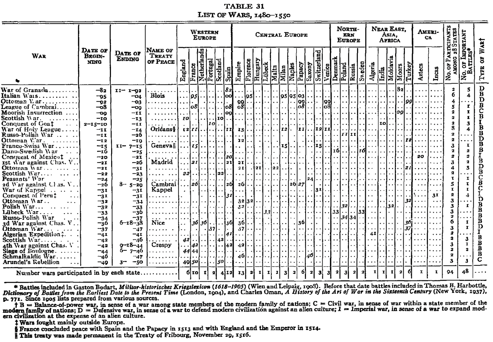 Una de les taules més conegudes de l’obra, que més s’utilitzaria en estudis posteriors, es troba a la imatge de la Figura 1.3. A les files, s’observa un llistat de guerres del període 1480-1550, i a les columnes, algunes de les seves característiques, com la data d’inici, la data de fi, els estats participants i l’any de la seva entrada a la guerra. A la darrera columna hi ha una tipologia interessant, en què es distingia entre guerra d’equilibri de poder (B), guerra civil (C), guerra defensiva (D) o guerra imperial (I). El llibre agruparia prop d’una dotzena de taules com aquesta, amb les guerres iniciades més enllà de 1550.