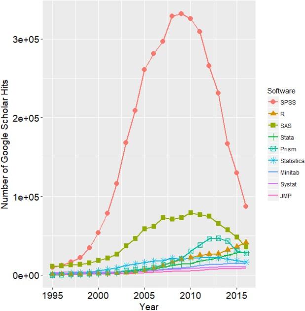 - I finalment, R està adquirint cada cop més popularitat en ciències socials. Fixeu-vos en els dos gràfics de la Figura 4.1 (a). Observem com el programa SPSS encara és utilitzat per molts acadèmics en ciències socials, probablement perquè és el que van aprendre de joves. Però en la Figura 4.1 (b) veiem com el seu ús va en descens i el programa que més puja és R. Python, un programa que també s’està popularitzant molt, però més en el món del màrqueting.