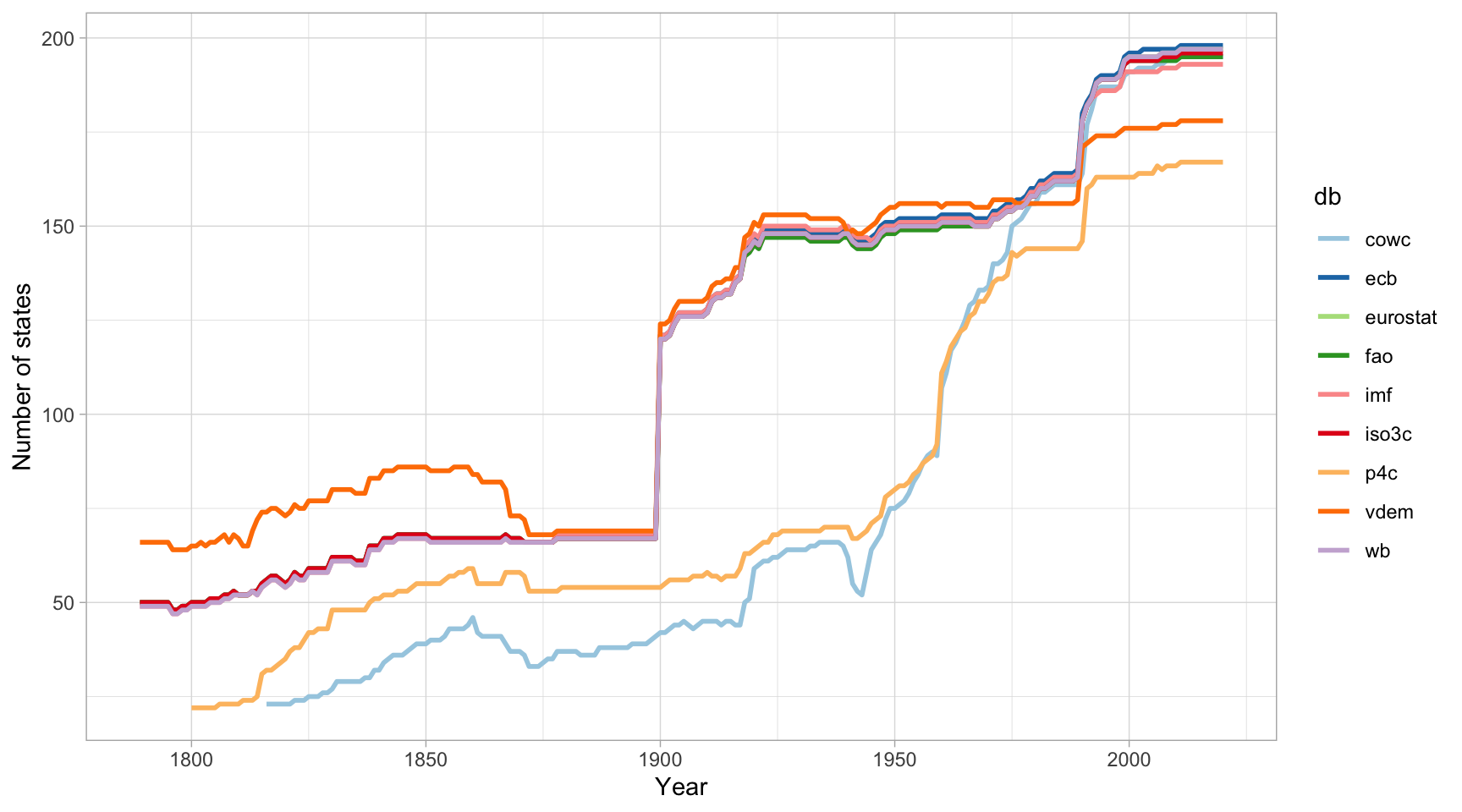 Vegem un altre gràfic, a la Figura 7.1, on observem les diferències en el recompte de països al llarg del temps entre diversos sistemes de classificació d’estats. En el diagrama de línies distingim clarament dues lògiques. La primera lògica inclou els projectes COW (cowc) i Polity (p4c), que presenten un nombre més aviat estable d’estats entre 1850 i 1950 i després experimenten un creixement sobtat. Això es deu al fet que aquests conjunts de dades consideraven les colònies com a divisions administratives, no com a estats, per la qual cosa no les van considerar com a tal fins al procés de descolonització que va tenir lloc als anys 60. La segona lògica de recompte, que inclou la resta de conjunts de dades, incorpora generalment més estats que el grup anterior. La característica principal d’aquest grup que observem en el gràfic és que el nombre d’estats experimenta un augment sobtat l’any 1900.