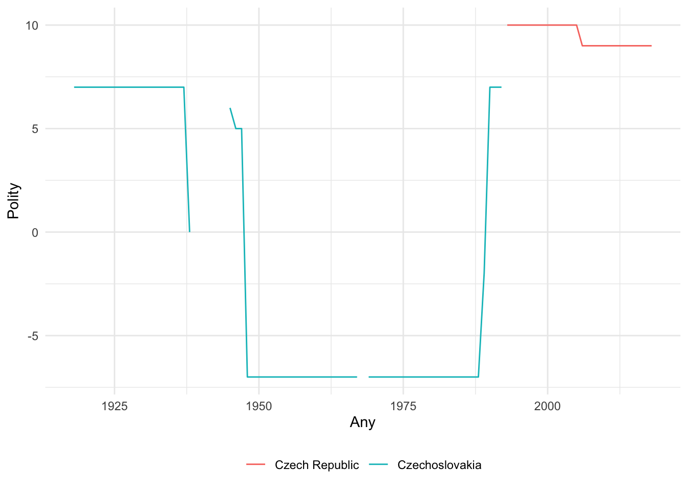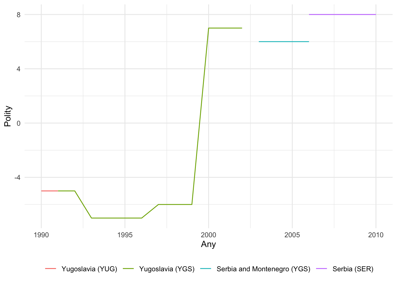 Un problema de mesura semblant se’ns presenta si, en comptes de les poblacions, volem estudiar les característiques dels estats, com ara els canvis institucionals o l’ocurrència d’eleccions. Per exemple, el projecte Polity (Marshall & Gurr, 2020), creat l’any 1974, pretenia estudiar les condicions que feien que alguns sistemes polítics fossin institucionalment més estables i d’altres més propensos al canvi. En aquest cas, el fet que un estat perdi part del seu territori és irrellevant si les institucions de l’organització política original continuen existint després del canvi territorial. Etiòpia hauria de ser tractada com la mateixa unitat abans i després de 1993 malgrat la pèrdua d’Eritrea. La mateixa lògica s’aplicaria a Xipre després del 1983 i al Pakistan després del 1971. Però, de la mateixa manera, un país que pateix un greu trencament institucional hauria de ser tractat com una unitat diferent després de l’esdeveniment disruptiu. Un bon exemple és el cas de Sèrbia/Iugoslàvia (el nom varia segons el conjunt de dades que utilitzem). El projecte Polity considera aquestes entitats com a categories diferents segons el moment: Iugoslàvia 1921-1991, Sèrbia i Montenegro 1992-2006 (sota el nom de Iugoslàvia fins a 2002), i Sèrbia a partir del 2006 (veure Figura 7.2). Altres conjunts de dades, en canvi, consideren Sèrbia/Iugoslàvia com la mateixa unitat al llarg del temps. El projecte V-Dem utilitza el terme Sèrbia per a tot el període 1804-2020 del seu conjunt de dades. El projecte COW utilitza el terme Iugoslàvia, tot i que considera que el país va deixar d’existir els anys 1942 i 1943.