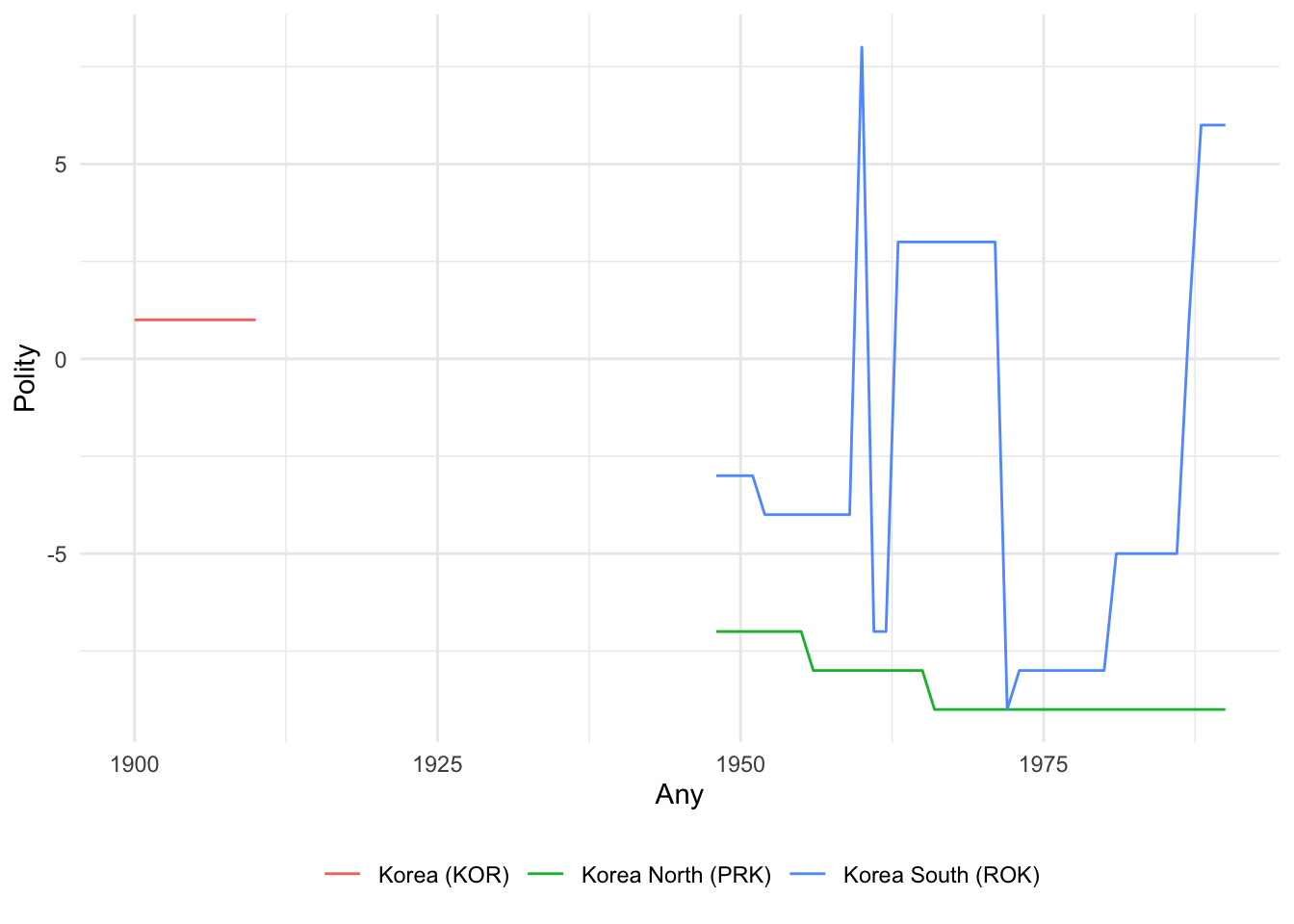 En aquests gràfics podem observar diversos trencaments de sèries temporals. Les figures mostren l’evolució de la democràcia a Sèrbia/Iugoslàvia, Vietnam, Corea i la República Txeca segons la base de dades Polity, sent 10 el nivell màxim de democràcia i -10 el nivell mínim. Veiem com en el territori actual de Sèrbia hi ha hagut tres estats diferents des de 1990. A Vietnam, el 1954 apareix Vietnam del Nord i el 1955 Vietnam del Sud. Aquest últim, deixa de tenir dades disponibles entre 1965 i 1972. El 1975 desapareixen Vietnam del Nord i del Sud i el 1975 comença la sèrie temporal de Vietnam.