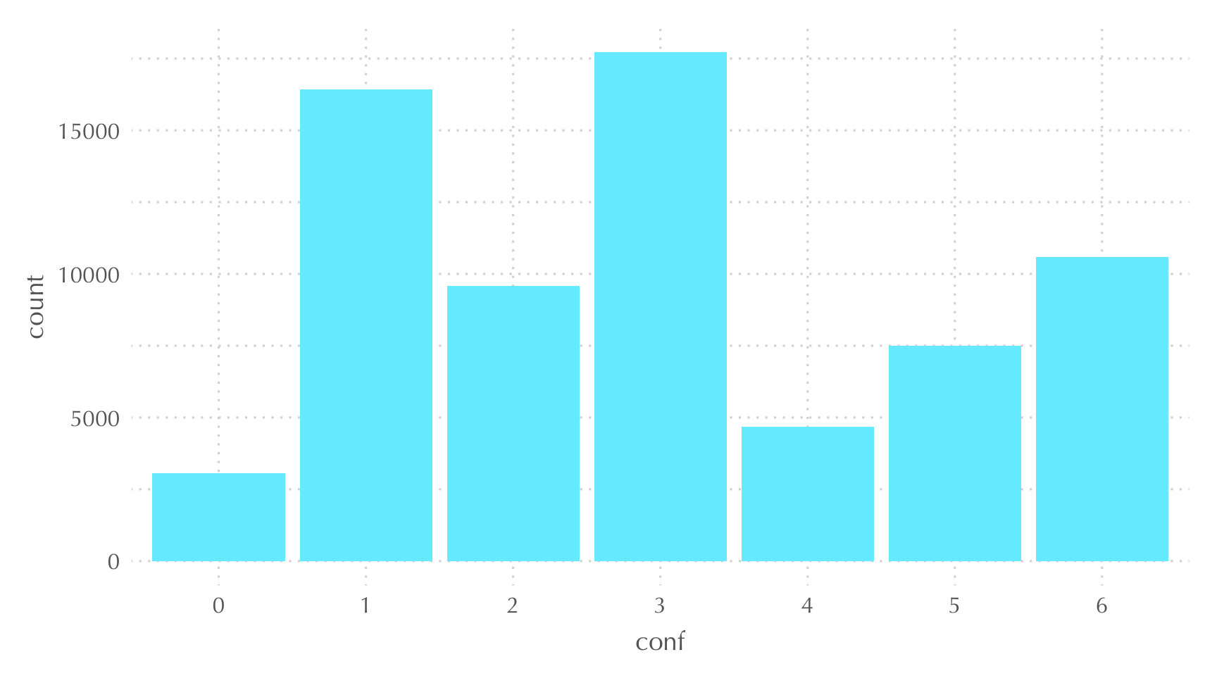 Finalment, només ens queda visualitzar el resultat de la nova variable conf, on mesurem el nivell de confiança vers els altres. Podem veure els resultats a la Figura 14.4.