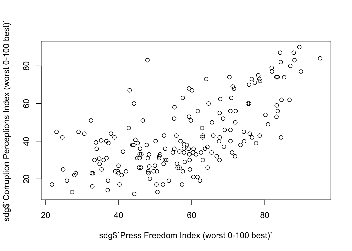 plot(sdg$`Press Freedom Index (worst 0-100 best)`,