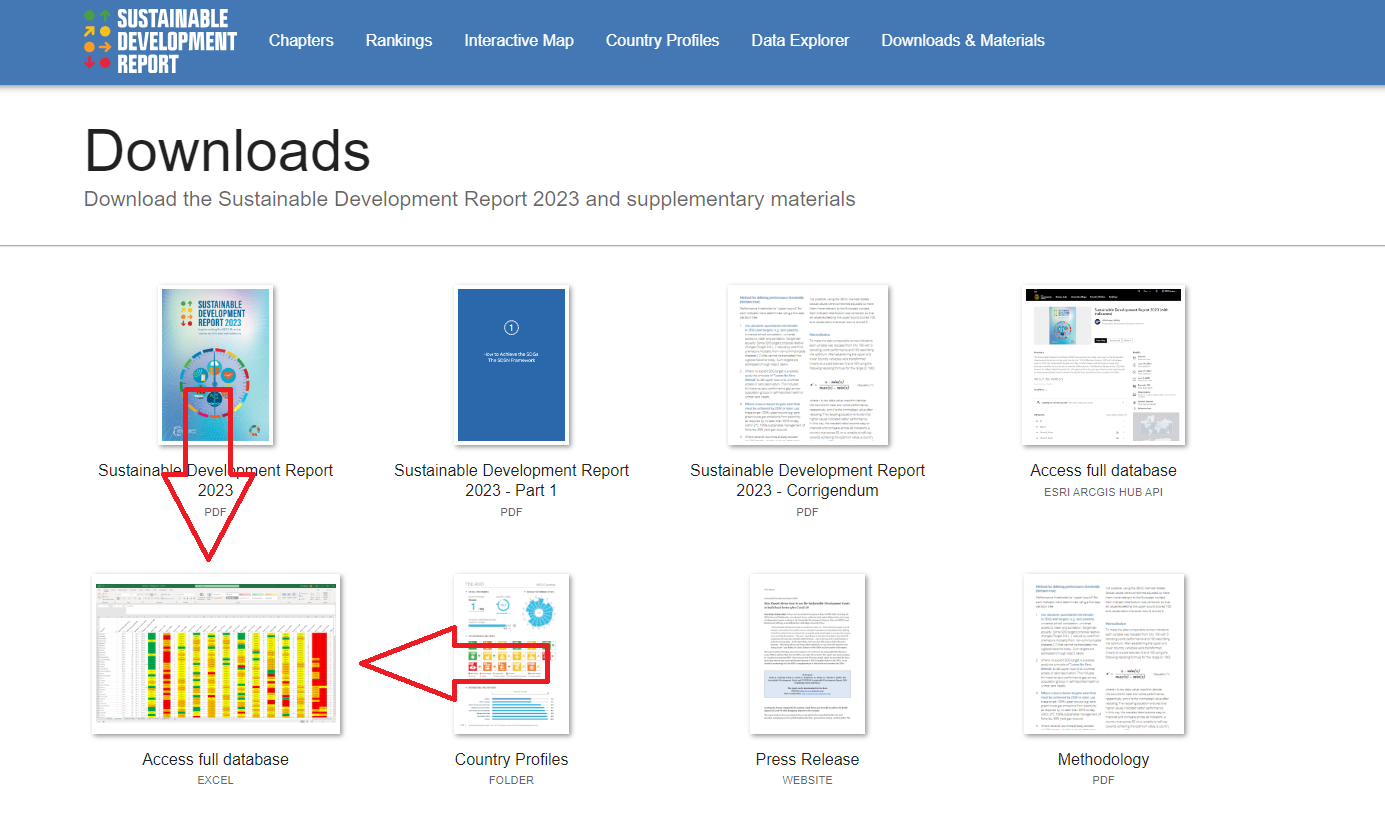Hi ha moltes maneres de treballar amb els ODS, ja que es troben disponibles en múltiples pàgines. Una opció és utilitzar alguna de les organitzacions que treballen amb aquestes dades, com el SDG Transformation Center que lidera l’economista Jeffrey Sachs. A la pàgina web d’aquest centre trobarem informes i també les dades actualitzades de cada any. A nosaltres ens interessa descarregar-nos els indicadors, que estan disponibles en format Excel. Per descarregar-los, seguirem aquesta ruta: